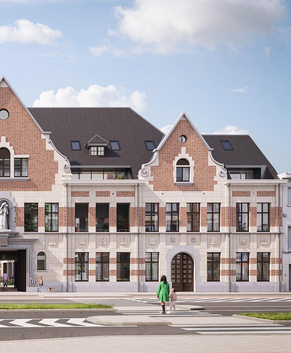 Achter de prachtige gevel van het voorgebouw komen 15 appartementen. De eclectische voorgevel wordt behouden, maar erachter komt een nieuwe structuur waarbij historische elementen geïntegreerd worden. Op die manier krijgt het karaktervolle gebouw een tweede leven met alle comfort. De appartementen en penthouses genieten van royale ramen, hoge plafonds, ruime inpandige terrassen en een echt markant karakter.